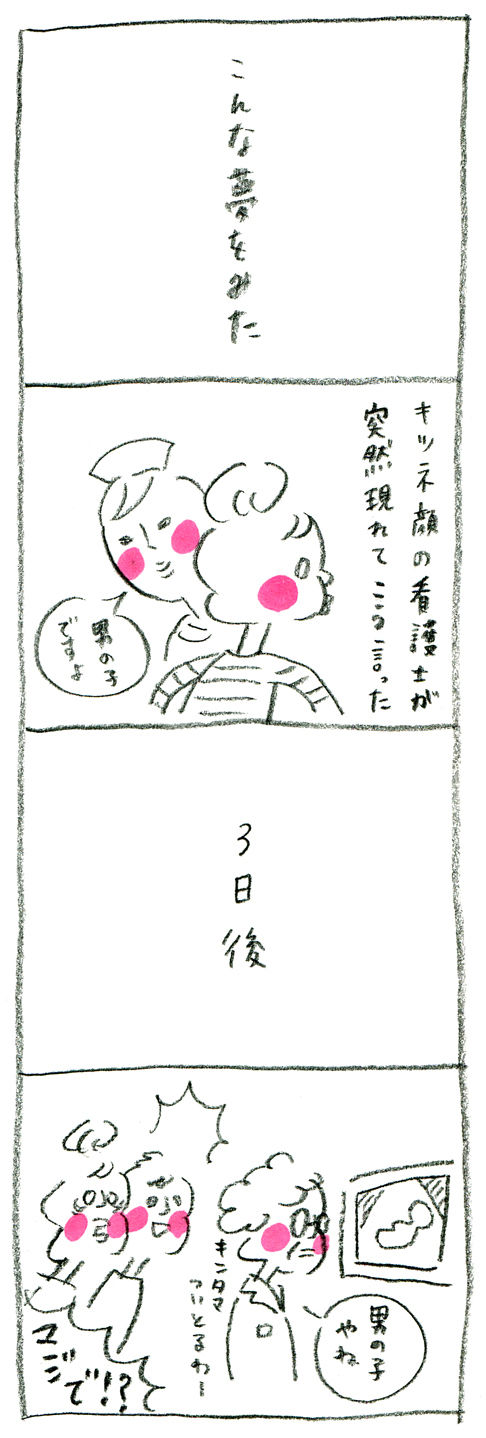 【妊娠日記20】夢 2014年05月27日 カテゴリ : 妊娠日記 偶然でしょうけどちょっとビックリしました。ずっと女の子がいいって言い続けてきたけど先生の「キ○タマついとるわ」の一言で脱力してなんかどっちでも可愛いなって思うようになりました。というわけで、産まれてくるのは男の子です。
