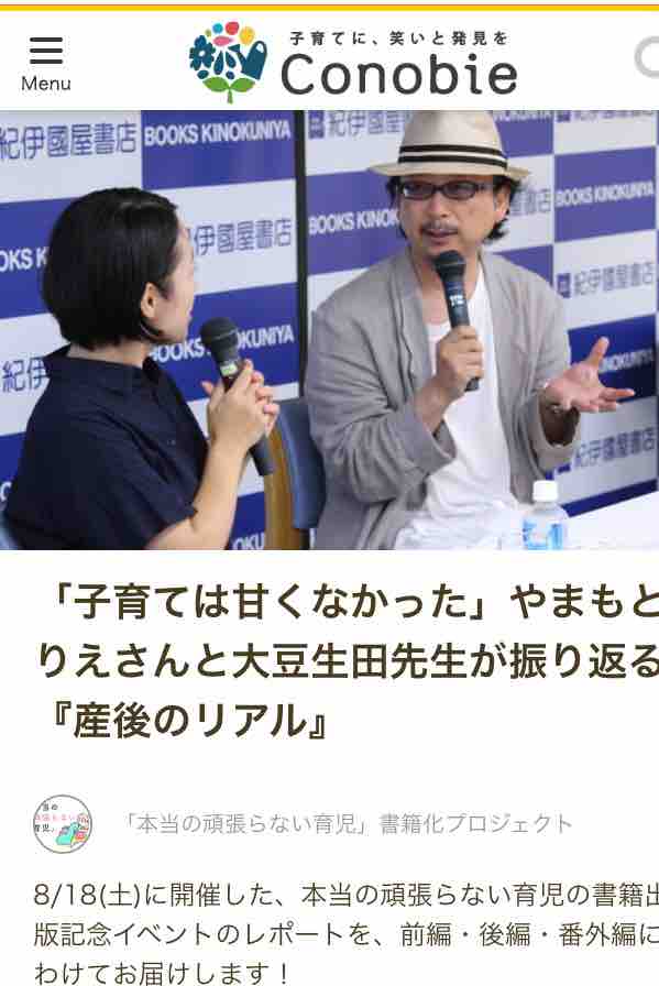 トークイベント 2018年09月28日 カテゴリ : コノビー 先日の大豆生田先生とのトークイベントが記事になりました!改めて読み返すと、さすが大豆生田先生は聞き上手だなぁとほれぼれ致しました。とにかく私が笑ってるのが文面からも伝わるかと↓記事はこちらです↓https://conobie.jp/article/12407第2弾のこちらから↓https://conobie.jp/article/12461